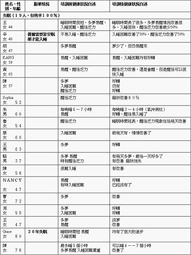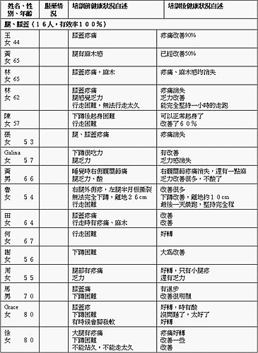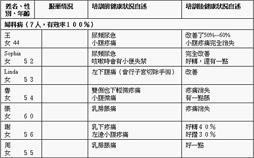 肩周炎、頸椎 病、腰痛、腿痛、失眠的患者都在15人以上,所以統計百分比的意義較大,其有效率基本上達到100%。其餘慢性病,如高血壓、心臟病、婦科病、男科病、呼吸系統病、胃病的有效率都在80%以上,只有耳疾的有效率是78%。這些基本統計雖然很初步,但基本上可以給出一個自癒力管理效果的輪廓。其實重要的不僅是身體的好轉,更是心靈的覺受和變化。心力是把雙刃劍,如果人心的能量從負面轉向正面,其意義深遠而巨大。