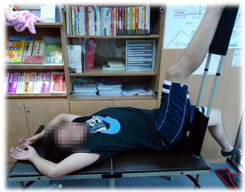 才躺上去,就可以看得出來筋緊有多嚴重。躺上拉筋椅就發現,屁股無法貼到立腳靠板,上舉的腿也無法伸直,手部更無法伸直貼齊耳朵,可見得筋緊到了什麼程 度!後來經過吳老師的詢問後才知道,他是讀電腦科系的,因此需要常常面對電腦、滑鼠,手的部分當然就很嚴重!另外,他拉筋時上舉的腿也可以看出小腿部分向 左偏,如下圖有O型腿的情況,再加上久坐不動,他自己又說自己也很少運動,身體當然就變成了這個樣子!更嚴重的是,這個弟弟才20歲就有失眠的情況!難怪 他母親聽過了吳老師的課之後就一定要叫他過來,因為拉筋對改善失眠有很好的效果!